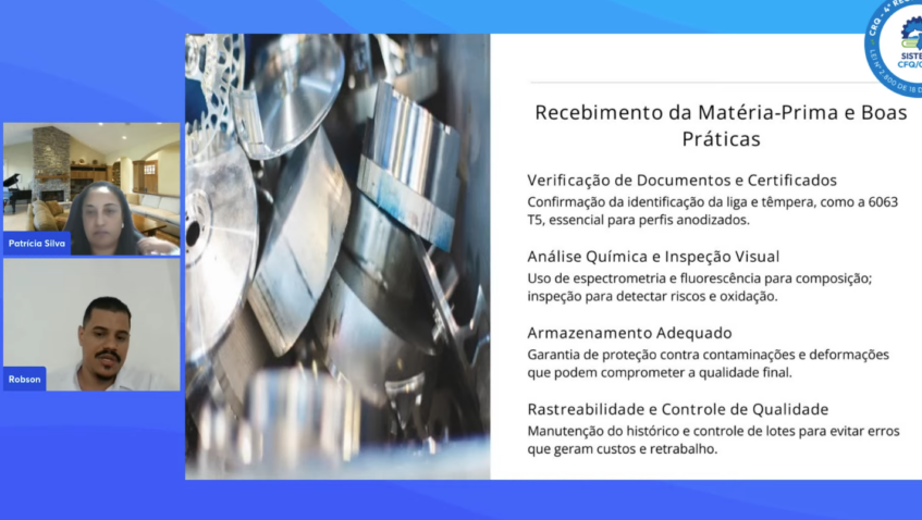 Explicou o que é anodização, como funciona sua linha produtiva e também o que consiste a pintura eletrostática e o tratamento de pintura por deposição química. Depois abordou como é feita a inspeção visual, que busca riscos, trincas e oxidação localizada no alumínio. Ao final Robson e Patricia apresentaram casos reais de falhas de qualidade e o que fazer para evitá-las. Eles responderam às perguntas dos participantes.