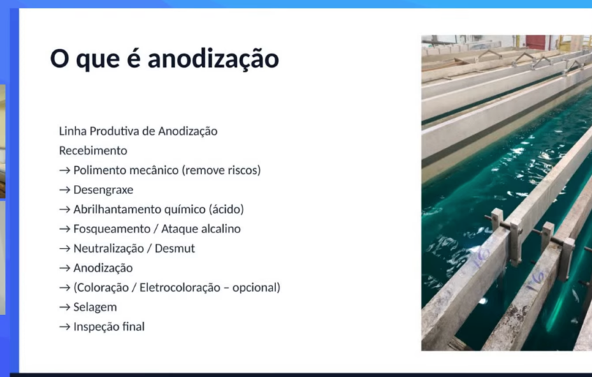 Patricia abordou a seguir o tratamento de superfície do alumínio, que inclui anodização e pintura eletrostática, um beneficiamento que protege contra corrosão e melhora a estética.