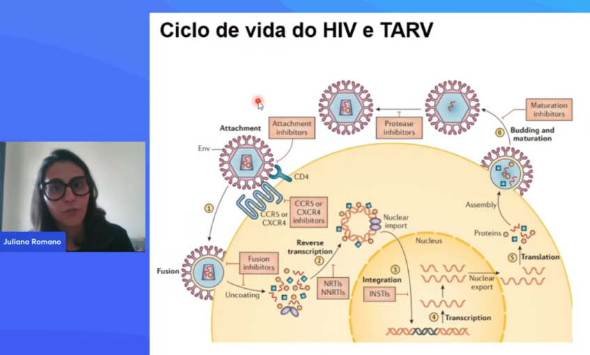 A seguir Juliana abordou o ciclo de vida do HIV, a propagação do vírus e como é o funcionamento dos medicamentos antirretrovirais. Explicou que os antirretrovirais são fármacos que conseguem inibir algumas etapas da propagação do vírus HIV. Disse que o tratamento precisa ser mantido ao longo de toda a vida do paciente, já que a infecção por HIV não tem cura, mas pode ser controlada.
