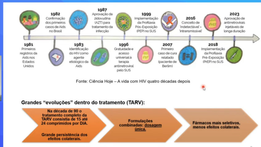 Juliana mostrou uma linha do tempo da AIDS, desde os primeiros registros em 1981 até 2023, com a aprovação de antirretrovirais injetáveis de longa duração.