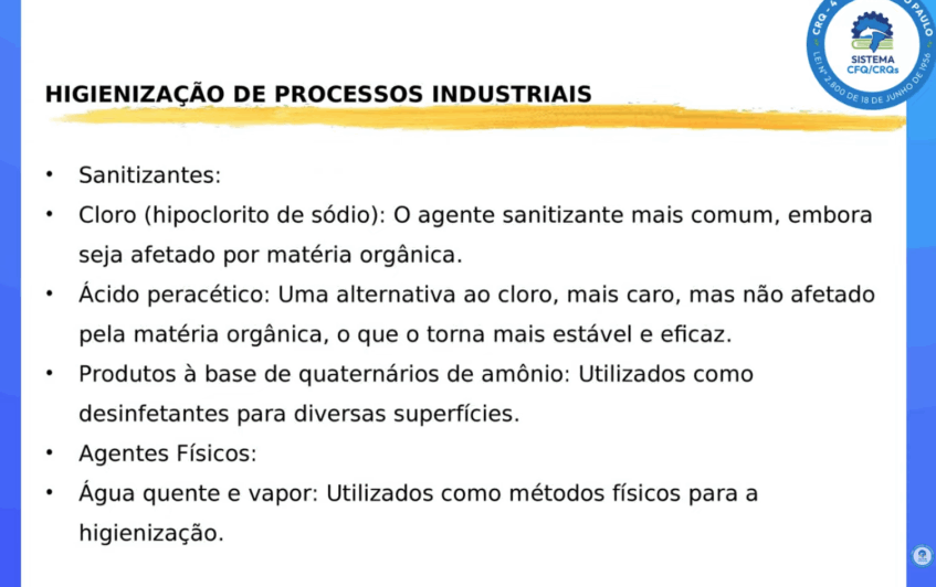 Lisandro listou os tipos de higienização disponíveis em processos industriais e as etapas da higienização, como enxágue, segundo enxágue, desinfecção e secagem, e ao final o descarte dos produtos utilizados, o que exige a presença de um técnico químico, um químico ou um técnico em segurança do trabalho.