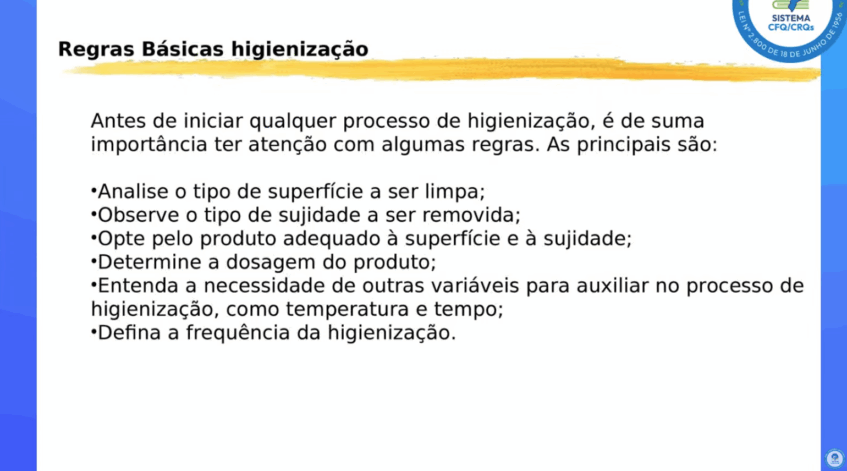 Relacionou as regras básicas da higienização, como observar o tipo de sujidade a ser removida e determinar a dosagem do produto, entre outras, e explicou como deve ser o sistema de gestão da qualidade, que consegue eliminar as não-conformidades, e verificar a eficácia dos processos.