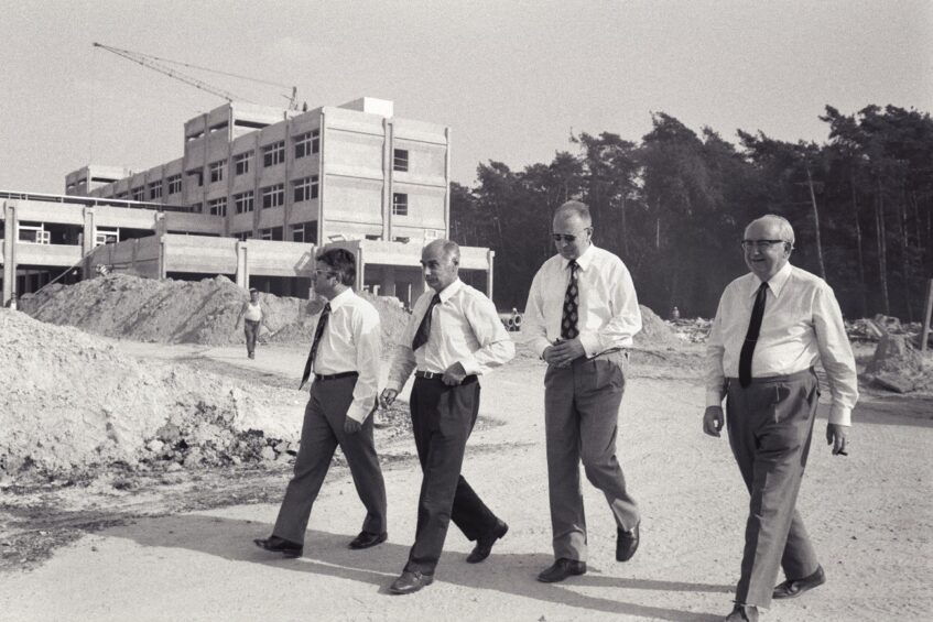 Georgy Flerov, o segundo da esquerda, visita as obras do GSI, o Centro de Pesquisas de Íons Pesados, em Darmstadt, na Alemanha, em 1973; elemento 114 homenageia o cientista russo. Foto A. Zschau, GSI/FAIR