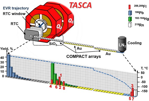 Diagrama incluído no estudo On the adsorption and reactivity of element 114, flerovium mostra o padrão de deposição dos isótopos 288 e 289Fl e de outros elementos.