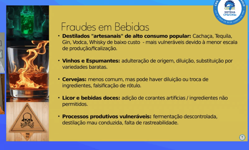 Na sequência, a especialista em segurança de alimentos, Renata Cerqueira, trouxe dados de uma reportagem publicada na imprensa em abril mostrando que quase 36% das bebidas alcoólicas vendidas no país são fraudadas, resultando em prejuízos de 88 bilhões de reais, além de sérios problemas de saúde e mortes.