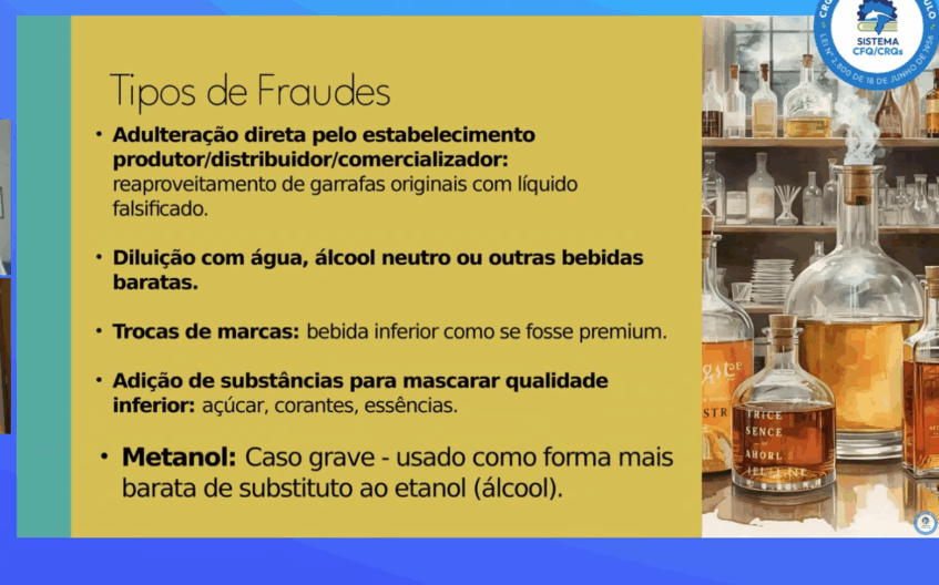Dra. Aline disse que quando trabalhava com análise de bebidas alcoólicas encontrava principalmente álcool de qualidade inferior, extratos, essências e corantes para simular uma bebida melhor. “Quando o consumidor conhece a bebida ele consegue identificar essas fraudes, mas numa festa, quando a bebida é misturada com outras, como energéticos, refrigerantes, gelo, fica muito difícil perceber a alteração”.