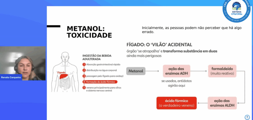 Ela explicou as características do metanol, que traz riscos à saúde quando ingerido, como náuseas, tontura, cegueira e morte, e que cada organismo vai agir de maneira diferente. A qualquer sintoma deve-se procurar ajuda médica, alertou.