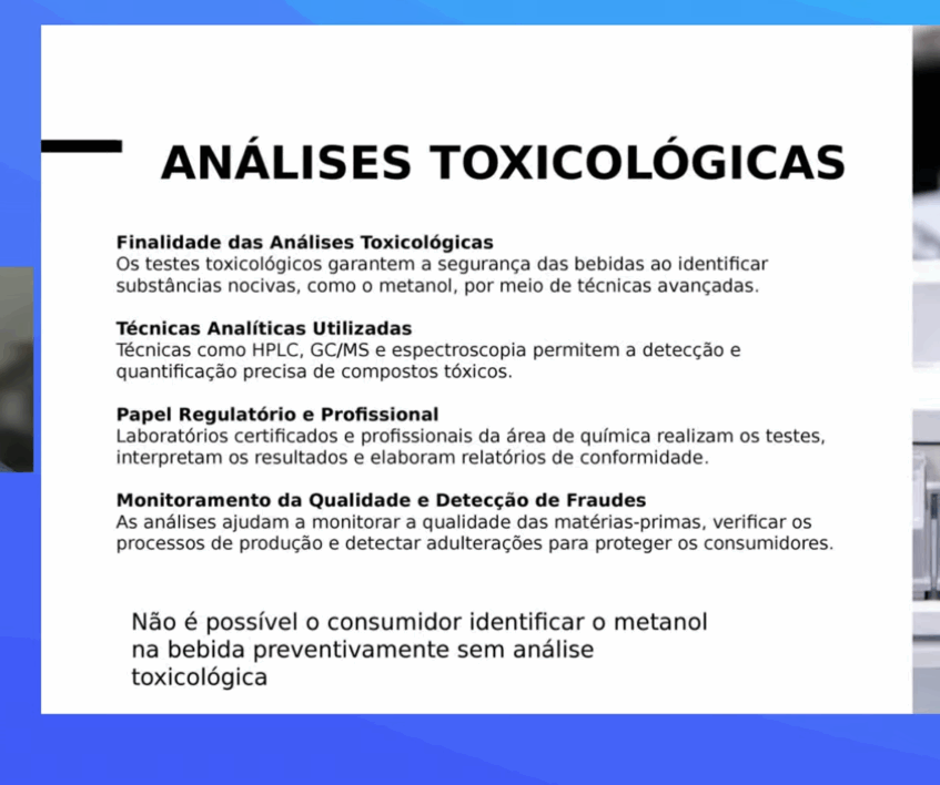 Falou sobre as análises que podem ser feitas em laboratórios, abordou as normas técnicas de controle de qualidade, como análises físico-químicas e microbiológicas, e a detecção de contaminantes. Disse que o consumidor precisa ficar atento a preços muito baixos das bebidas e deve checar lacres e rótulos, e principalmente, procurar ajuda médica se apresentar sintomas estranhos.