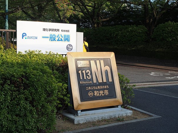 Placa no centro de pesquisas RIKEN, no Japão, comemora a descoberta do nihônio. Foto: Wikimedia Commons.