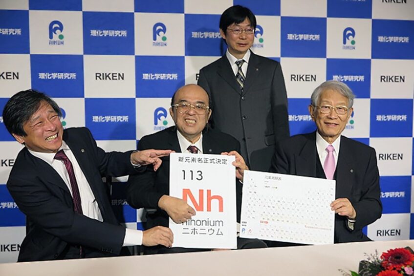 Foto de dezembro de 2016 mostra os cientistas Kosuke Morita, Koji Morimoto e Hiroshi Matsumoto, presidente do centro de pesquisas RIKEN, comemorando a descoberta do elemento 113 e a oficialização de seu nome, que faz referência ao Japão. Foto: Wikimedia Commons.
