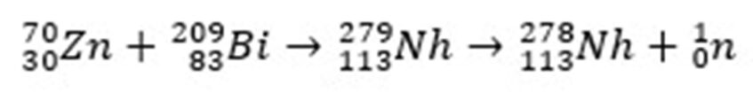No primeiro exemplo, o zinco é acelerado a 10% da velocidade da luz, de modo a superar as forças repulsivas dos dois núcleos. Produz-se então um isótopo 279Nh, que emite um nêutron e produz o 278Nh.