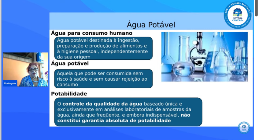 Depois, Rosângela esclareceu o que a Organização das Nações Unidas considera que seja uma água segura, ou seja, uma oferta de água que não representa um risco significativo à saúde, que tenha quantidade suficiente para atender a todas as necessidades domésticas e que esteja disponível continuamente. A ONU já publicou vários comunicados sobre o direito humano à água.