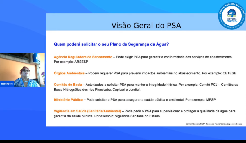 Para tratar de questões envolvendo o Plano de Segurança da Água, a Comissão Técnica de Meio Ambiente do CRQ-SP promoveu nesta segunda-feira a live Plano de Segurança da Água (PSA): desafios da implementação da norma ABNT NBR 17.080/23, no canal do Conselho no YouTube.
