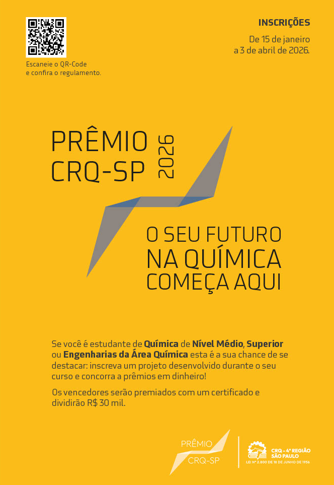 Estão abertas as inscrições para a 28ª edição do Prêmio CRQ-SP, concurso que visa estimular a pesquisa entre estudantes de cursos técnicos e superiores da área da Química em São Paulo. Interessados podem inscrever projetos desenvolvidos ao longo do curso – monografias, trabalhos técnicos, científicos ou tecnológicos – até o dia 3 de abril de 2026.
