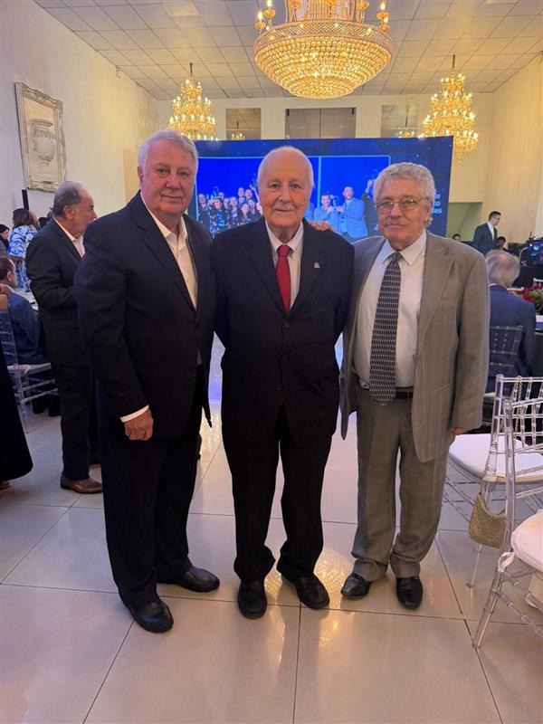 Hans Viertler acompanhado pelo vice-presidente, Nelson Bonetto, e pelo Conselheiro Carlos Trevisan, também homenageado na cerimônia. (Clique para ampliar)
