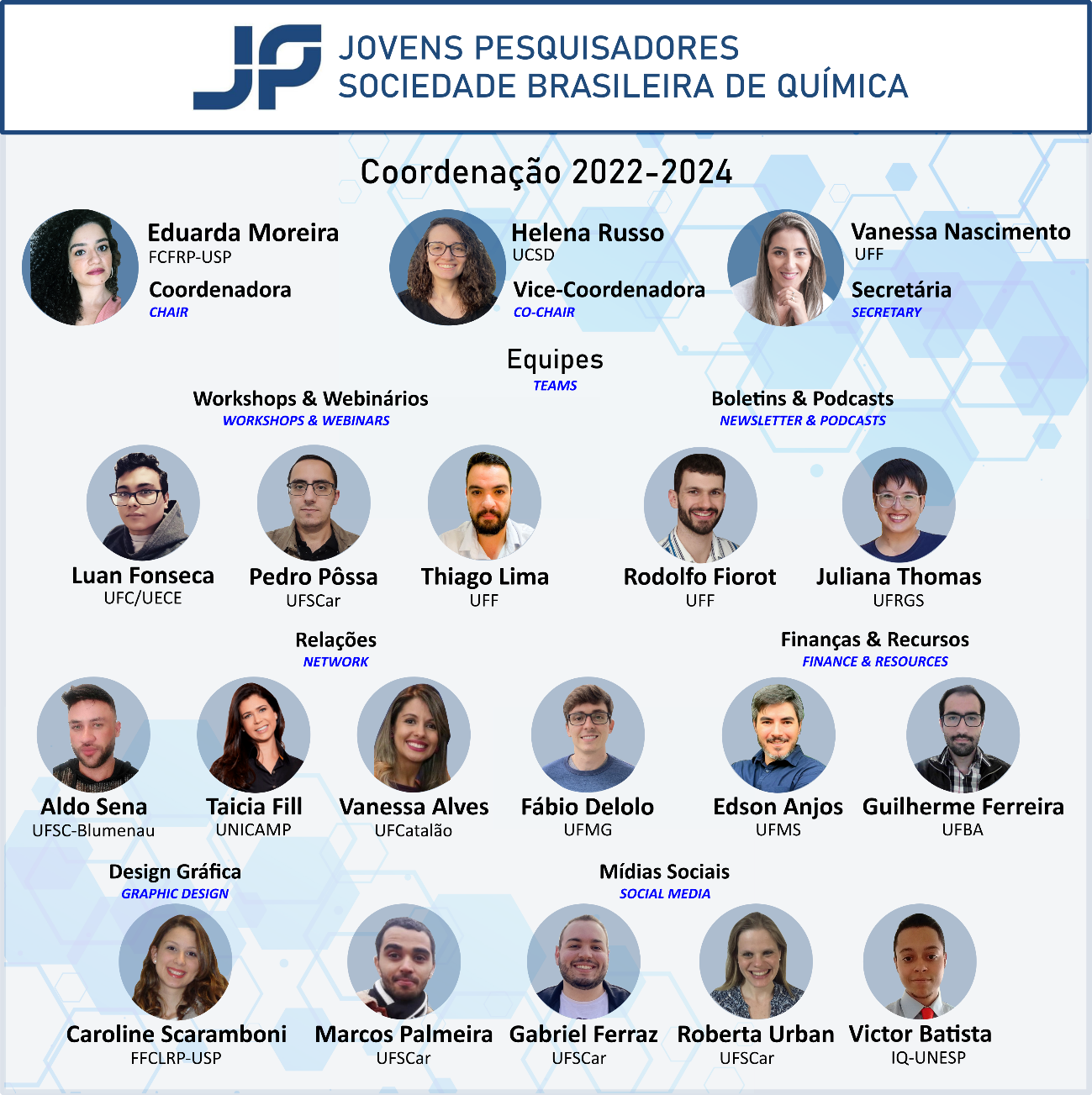 O comitê Jovens Pesquisadores representa pesquisadores em início de carreira associados à SBQ, e reúne estudantes de pós-graduação em nível de mestrado e doutorado, pós-doutorandos e pesquisadores já atuantes no mercado de trabalho, tanto em instituições públicas ou privadas quanto acadêmicas ou empresariais. No biênio 2022-2024 o comitê tem como coordenadora Eduarda Antunes Moreira, como vice-coordenadora Helena Mannochio Russo e como secretária Vanessa do Nascimento.
