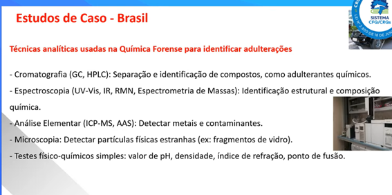 Marcia citou muitos outros exemplos de fraudes, e falou sobre as técnicas analíticas usadas na Química Forense para identificar adulterações, como cromatografia, espectroscopia, análise elementar, microscopia e testes físico-químicos.