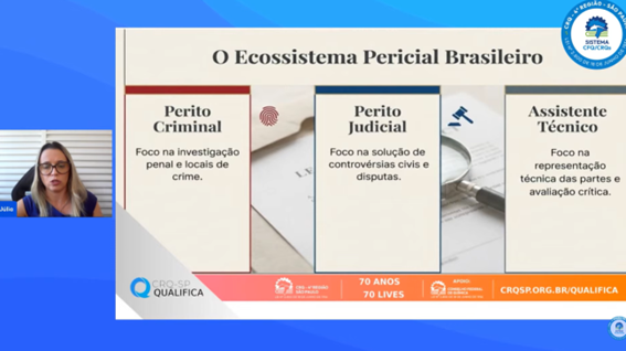 Na sequência, Julia Buci falou sobre a atuação pericial no Brasil e o universo da criminalística e da química forense. Ela explicou que a criminalística aplica conceitos técnicos e científicos para identificar, analisar e interpretar evidências materiais em infrações, como alimentos adulterados, contaminantes químicos, resíduos tóxicos, fraudes industriais e adulteração de combustíveis. Ela explicou o papel do perito para compreender os fatos que dependem de conhecimento técnicocientífico.