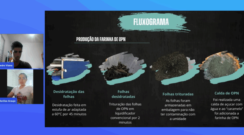 Marilize Araújo explicou a seguir como foi a produção da farinha de Ora-pro-nóbis, que teve a sequência de desidratação das folhas, sua trituração, e a preparação de uma calda. Na sequência foi feita uma mistura base com leite de coco, açúcar e estabilizante. Para o preparo do sorvete houve adição de emulsificante, cacau e a calda de Ora-pro-nóbis. A ultima etapa foi o tempo de congelamento, de 5 a 6 horas. O grupo também produziu a casquinha artesanalmente, sendo uma delas rica em clorofila.